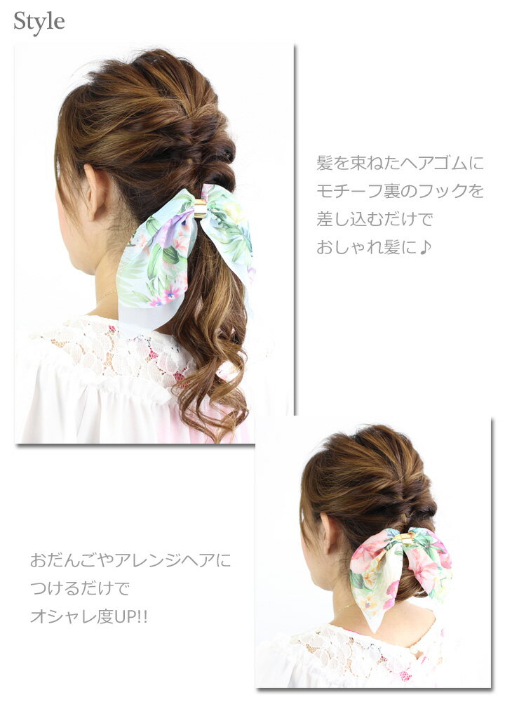 商品説明 使い方は髪を束ねたヘアゴムにモチーフ裏のフックをひっかけるだけ!! いままでのモチーフつきヘアゴムですとモチーフの位置や向きが思ったように決まらなかったり、 ゴムが伸びてしまって使えなくなってしまったりと。