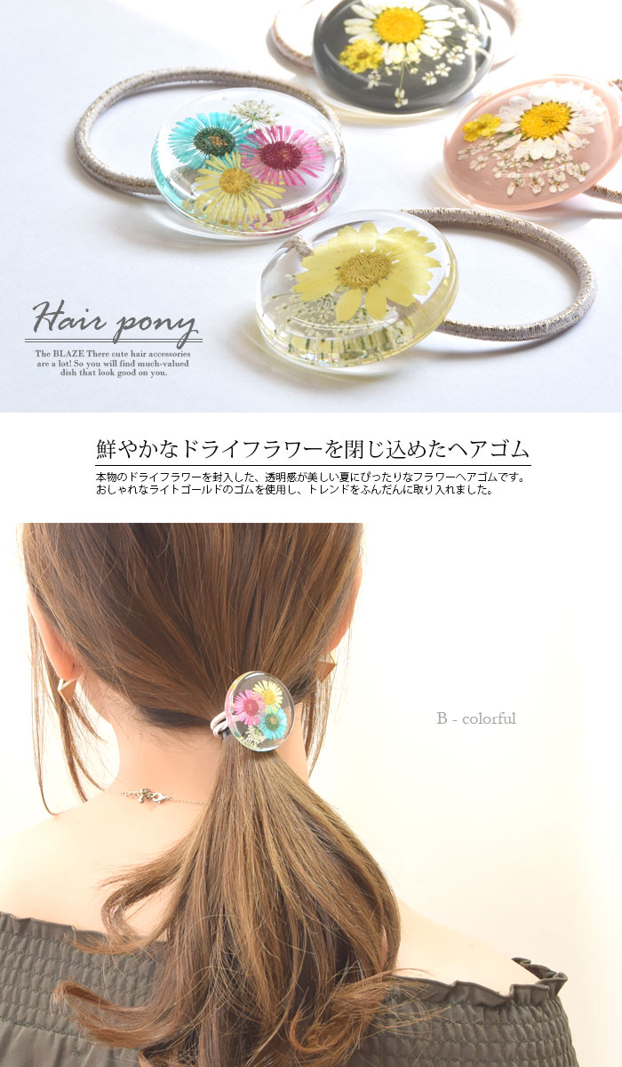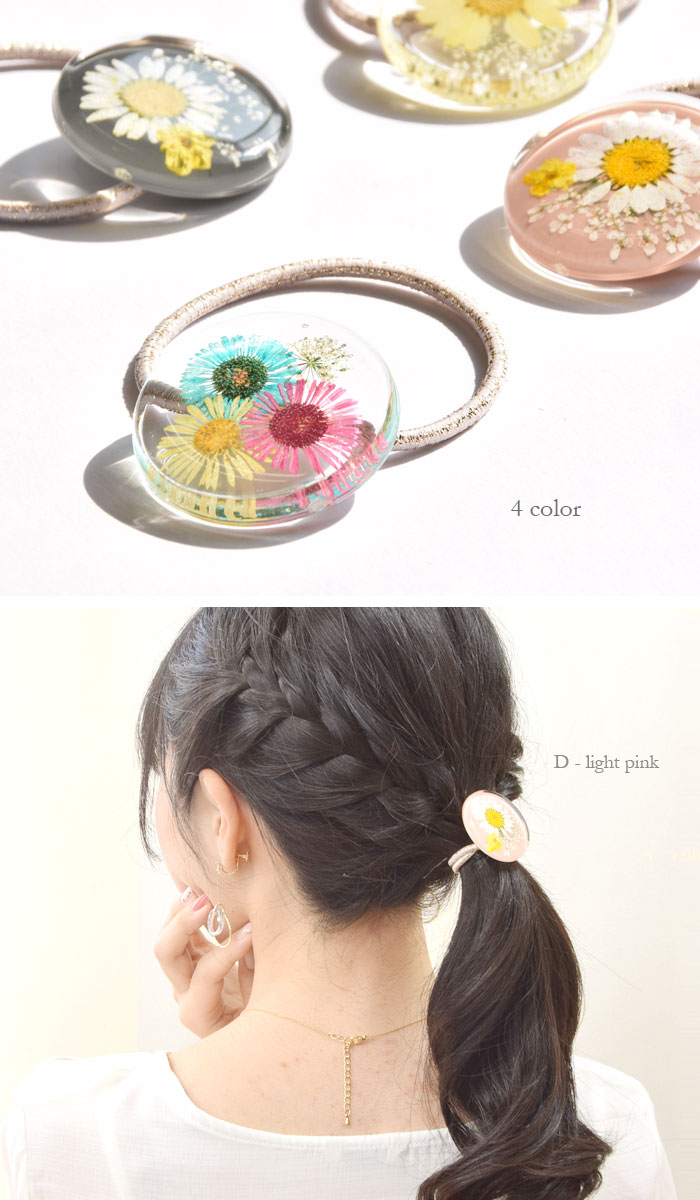 商品名 ドライフラワーヘアゴム(大きめラウンド) (dpy-680-005) STAFFコメント ビジューの中に可愛いお花のドライフラワーを封じ込めた宝石のようなヘアゴム♪